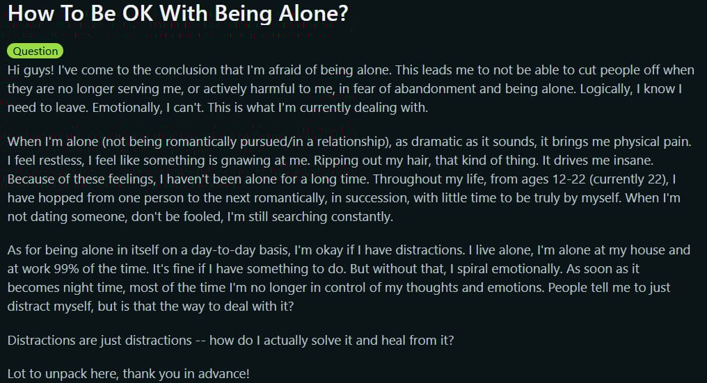 I pick that post one because he had courage to admit to himself he is lonely unlike many other people who continue to deny it.